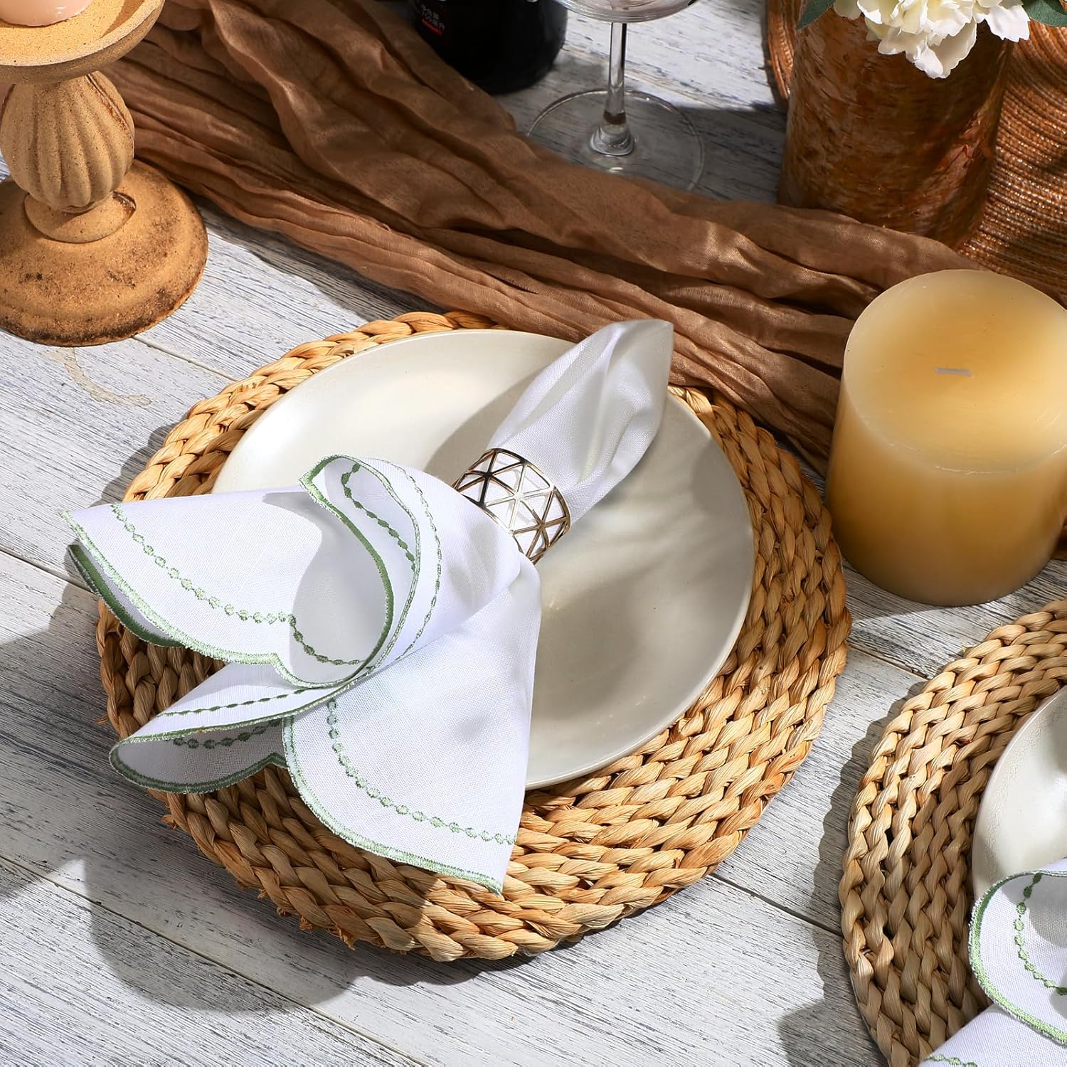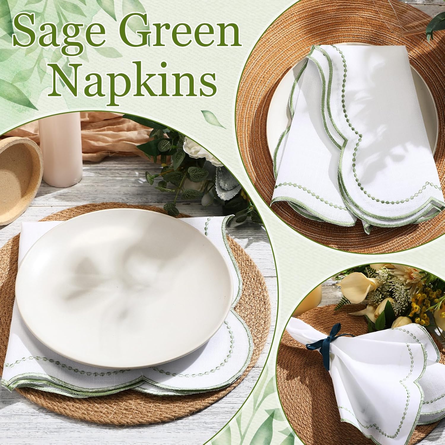 Features: This napkin cloth is suitable for creating a warm and beautiful atmosphere during Thanksgiving celebrations. It will elevate your dining experience, not only stimulating your appetite but also pleasing your eyes, setting the stage for a joyful and memorable meal. This square napkin is washable, and you can fold it for easy storage. Specifications: Material: polyester Color: sage green Size: approximately 18 x 18 inches / 46 x 46 cm Package includes: 12 x Scalloped Embroidery Cloth Napkins Notes: Manual measurement, please allow slight errors on size. The color may exist a slight difference due to different screen displays.