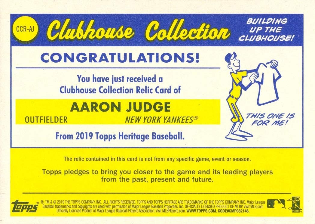 2019 Topps Heritage Clubhouse Collection Relics #CCR-AJ Aaron Judge Game Worn Yankees Jersey Baseball Card - New York Yankees. This card features a piece of Yankees jersey worn by Aaron Judge during a game. Its authenticity can be found on the back of the card. Card is in Near Mint to Mint condition. Stock photo shown.