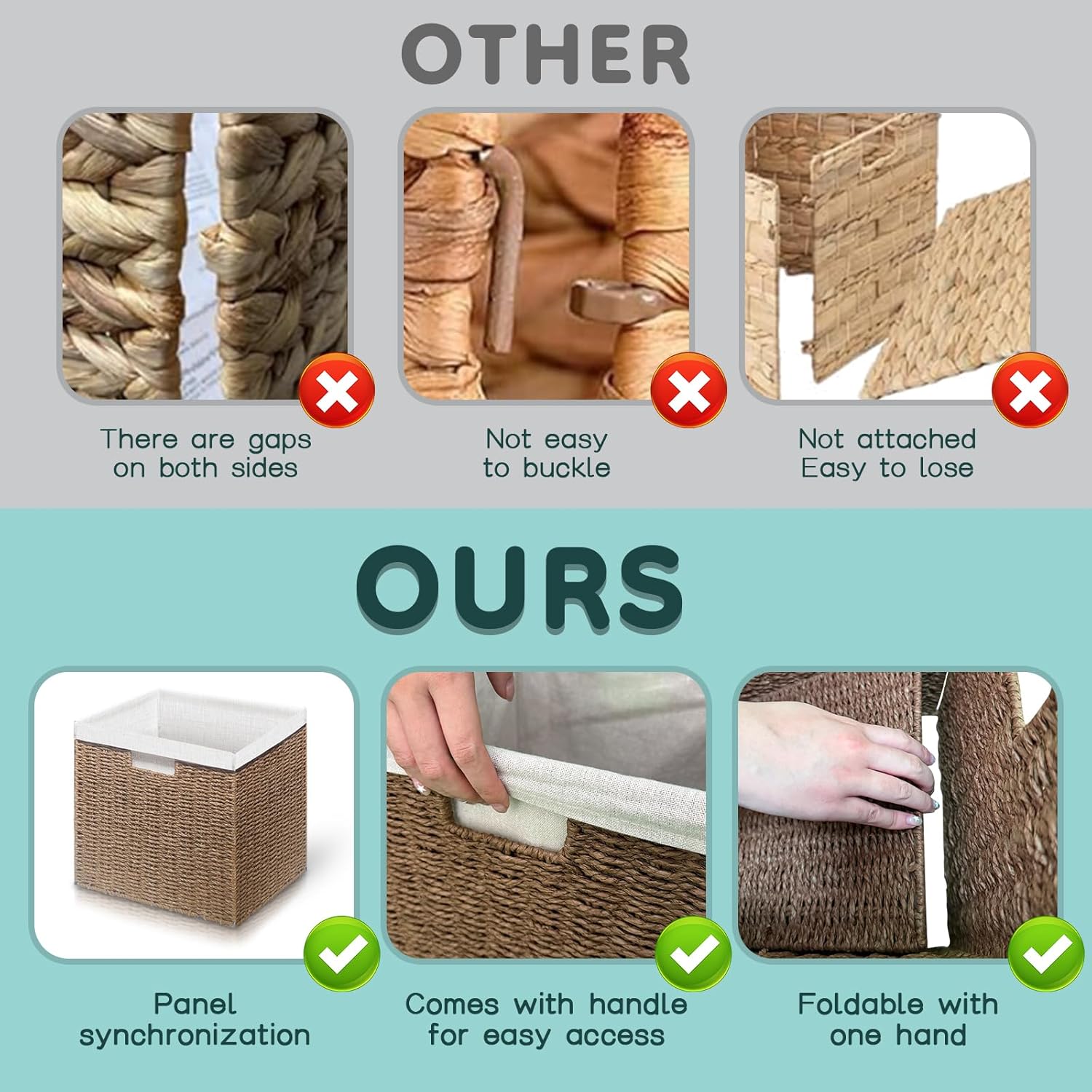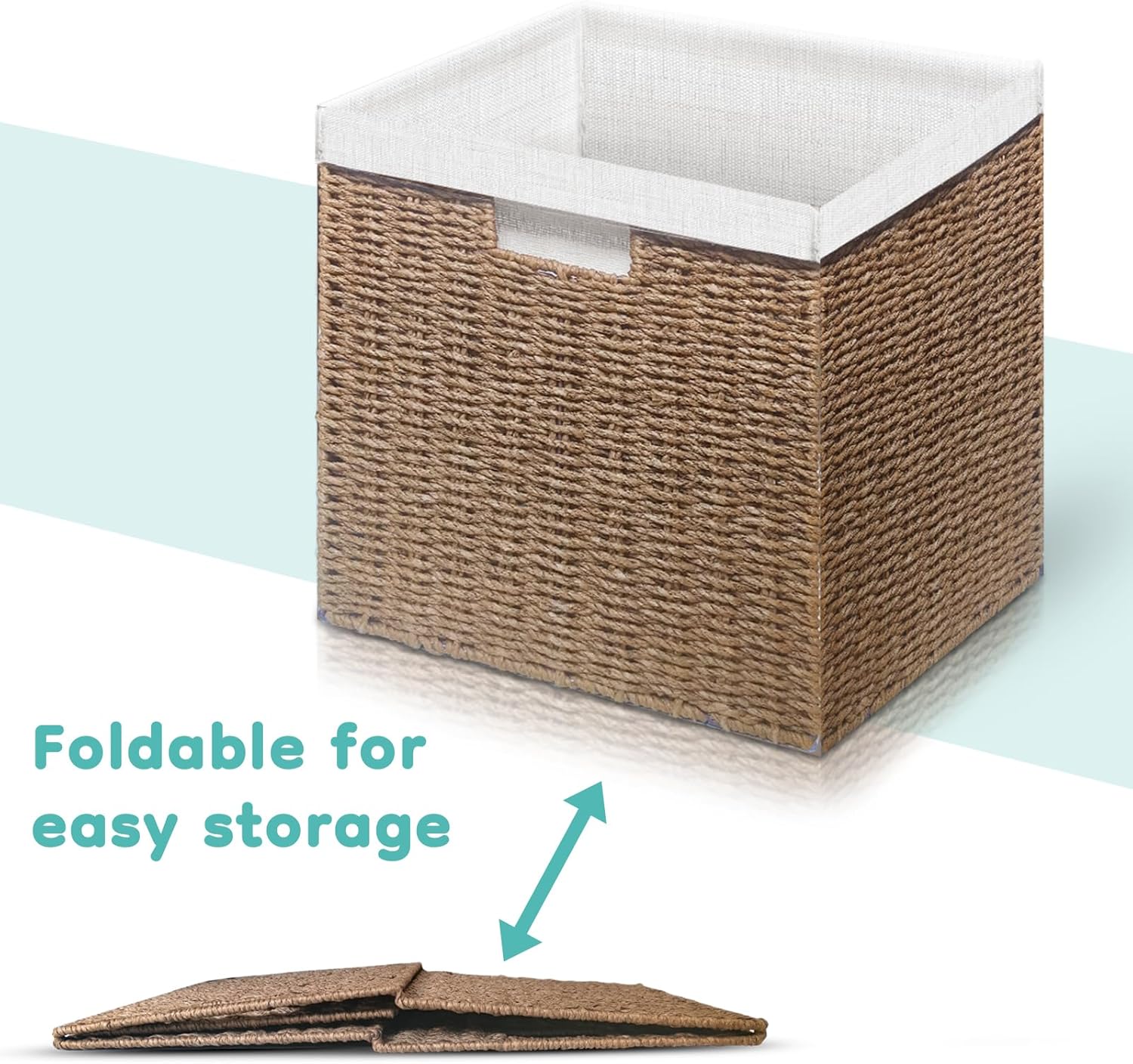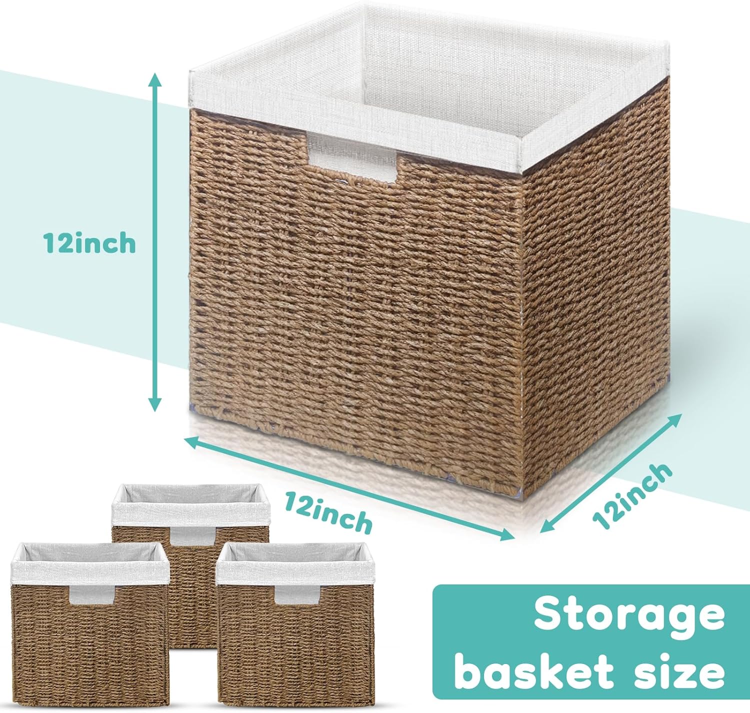 Made from 100% recycled paper rope, these square, cube-shaped baskets are not only stylish but also safe for your home and the environment. Measuring 12 inches on all sides, they fit perfectly under tables or in cube storage cabinets. Each basket features two convenient cutout handles for easy carrying and comes with a liner for added beauty. When not in use, simply fold them flat to save space. Ideal for organizing toiletries, towels, blankets, and more.