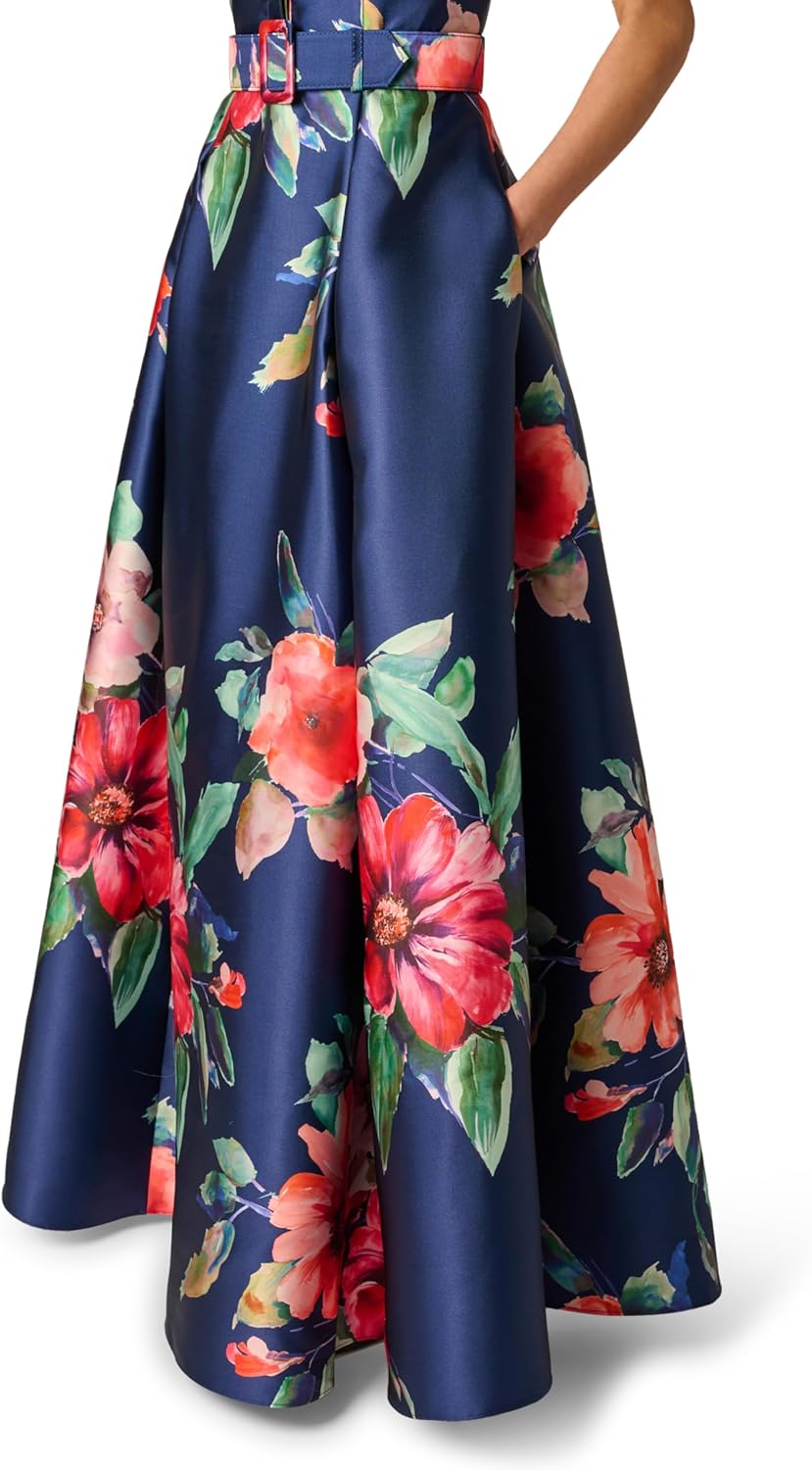 Refined structure meets lush volume in this stunner of a gown. Tailored from luminous Mikado fabric, the dress is printed with a vibrant oversized magnolia floral motif. The fit and flare silhouette is defined by precise princess seams and a full pleated skirt, creating graceful movement with every step. A structured mandarin collar, short sleeves, and a button front bodice lend a polished finish, while the matching belt cinches the waist. Make an entrance in this classically opulent evening dress, perfect for garden weddings, galas, or daytime formal events.