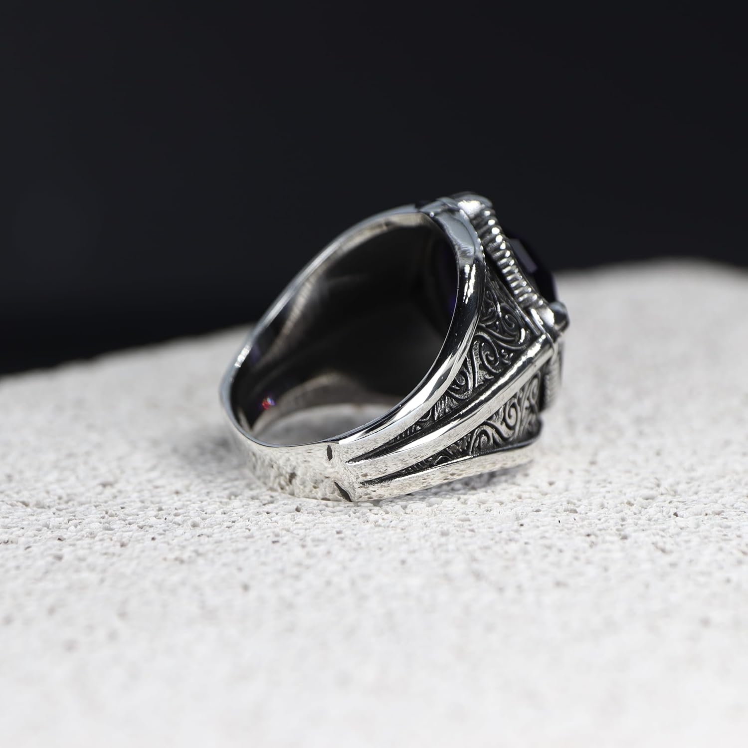 Mirari Jewelry's Handmade Amethyst Men's Ring: A Timeless Silver Masterpiece Introducing the Amethyst Men's Ring by Mirari Jewelry, an exquisite blend of natural beauty and artisanal craftsmanship. This handmade silver ring is designed for the sophisticated gentleman who values both elegance and quality. The centerpiece of this men's ring is a captivating amethyst stone, known for its striking purple hue and calming properties. This amethyst ring is meticulously set in a sterling silver band, showcasing the superior craftsmanship that defines Mirari Jewelry. The sleek design ensures this gemstone ring stands out as a statement piece, perfect for any occasion. Ideal as a gift for men, this amethyst stone ring adds a touch of refinement to both formal and casual outfits. The elegant yet robust design of this silver ring for men ensures it complements any style, making it a versatile addition to any jewelry collection. The amethyst, celebrated for its associations with peace and clarity, adds both aesthetic and symbolic value to this exquisite piece. This silver ring for men is more than just a piece of jewelry; it's a symbol of sophistication and timeless beauty. The combination of the deep purple amethyst and the polished sterling silver band creates a stunning contrast, making this ring a standout accessory. Whether you're celebrating a special occasion or simply want to show someone you care, this amethyst ring from Mirari Jewelry is a thoughtful and exceptional gift for him. Experience the unparalleled beauty and craftsmanship of the Amethyst Men's Ring from Mirari Jewelry. Order yours today and embrace the perfect blend of elegance and modern style with this extraordinary handmade silver ring.