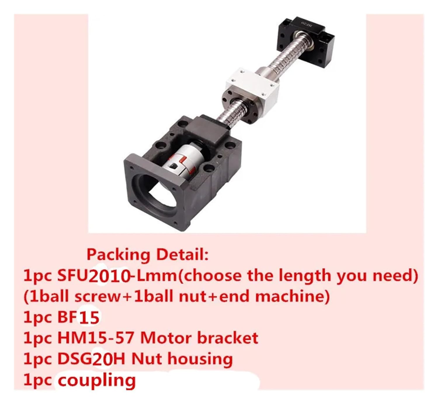1. Screw fixation, strong stability, the optical axis and the aluminum bracket are fixed with screws, stable and tight2. High speed, not easy to heat up, and long service life, less drive power required3. High dimensional accuracy, low friction coefficient, good wear resistance,used convenientSpecifications:Model: SFU2010Guide rail width or diameter: 20mmManufacturing process: rolled threadBall screw nut: singlePitch: 10mmHM15: support diameter 15mm86: nema 34 motorNut housing: DSG20HSupport: BF15Packing list:1pcs SFU2010-L mm (1 ball screw + 1 ball nut + end machine)1pcs BF151pcs HM15-861pcs DSG20H nut housing1pcs D25L30 8x12mm flexible coupling