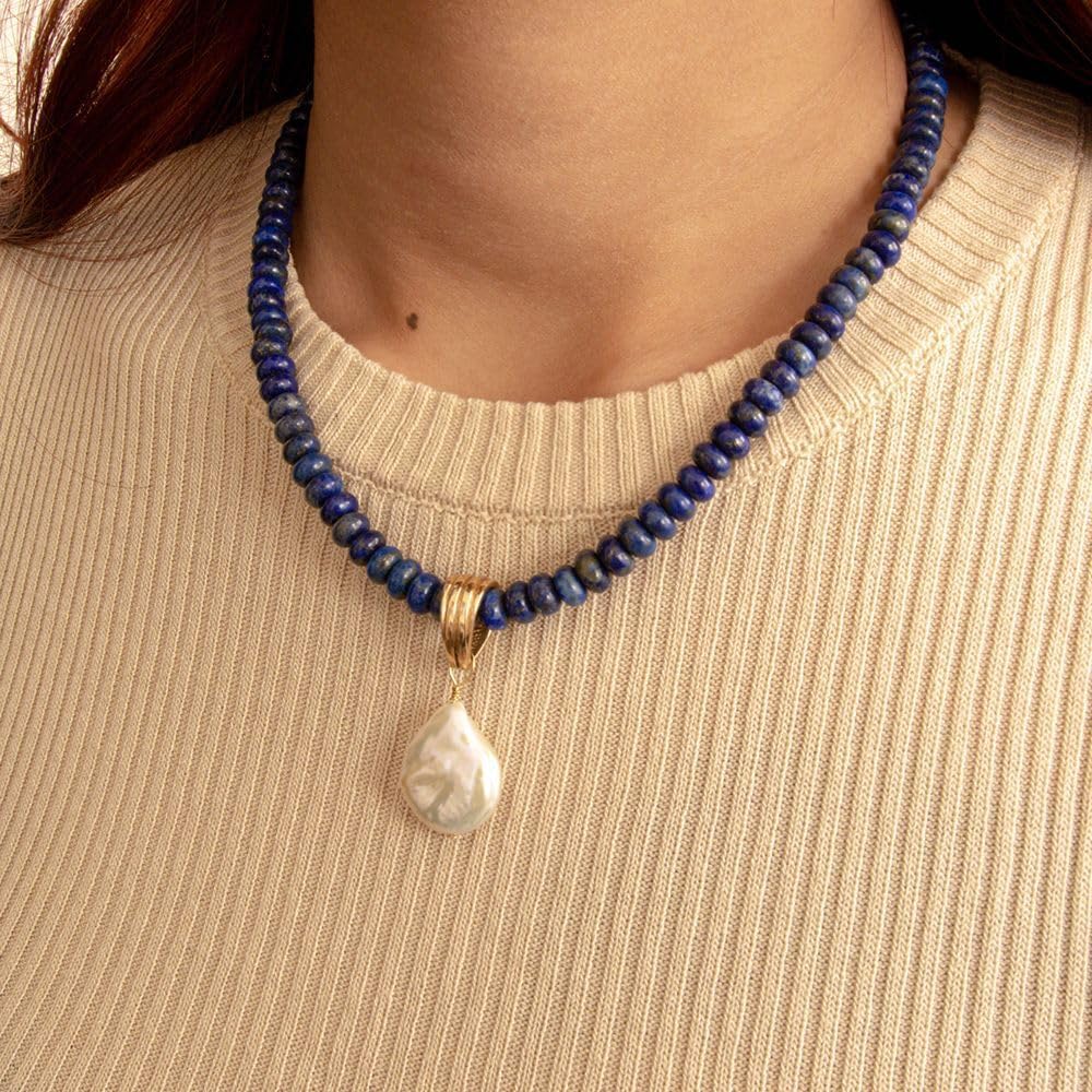 • This elegant necklace features numerous genuine blue lapis beads, and a hanging pendant made of genuine white mother of pearl at its center, all accented with golden bronze details.