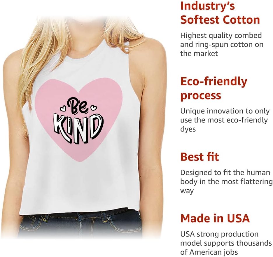 Cute and flattering Be Kind Heart Print Racerback Cropped Tank is suitable for most indoor or outdoor activities, such as gym, yoga, running, hiking, beach or relaxing around the house. Pair Print Women's Tank with your favorite sports bras, especially strappy ones, and high-waisted leggings, then you will enjoy cool and comfortable exercise throughout the summer.