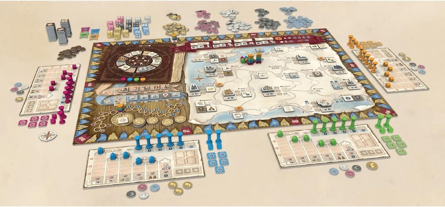 | Included Components | 1 X GAME BOARD 4 X PLAYER BOARDS 1 X COMPASS ROSE MARKER 20 X RESOURCE DICE 1 X DICE BAG 1 X ACTION WHEEL 6 X ACTION TOKENS 20 X ACTION COUNT TOKENS 8 X TOWN TILES 11 X FAIR TILES 4 X FAIR ORDER TILES 25 X CATHEDRAL TILES Supplier Product Information: Tiletum 9 X CONSTRUCTION COST TILES 6 X CORRUPTION TOKENS 54 X BONUS TILES 26 X CONTRACT TILES 45 X CHARACTER TILES 1 X “+100/+200” VICTORY POINT MARKER PER PLAYER 5 X BONUS ACTION POINTS MARKERS PER PLAYER 8 X HOUSES PER PLAYER 7 X PILLARS PER PLAYER 1 X MERCHANT PER PLAYER (4) 1 X ARCHITECT PER PLAYER (4) 3 GENERIC MARKERS PER PLAYER (SCORING MARKER, KING TRACKMARKER, AND TURN ORDER MARKER) RESOURCE TOKENS IN DENOMINATIONS OF 1 AND 5: GOLD, FOOD, WOOL, STONE, AND IRON |