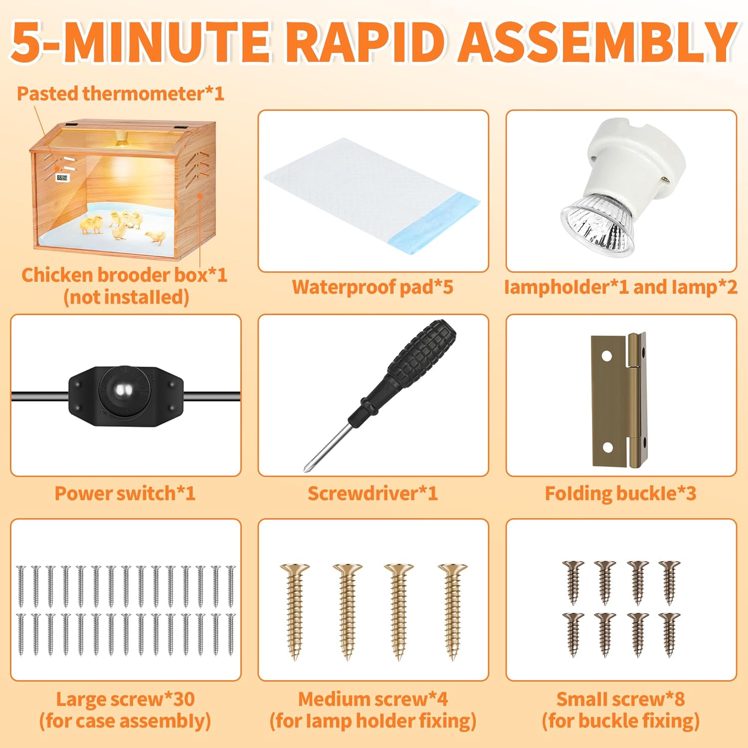 • User-Friendly:It features easy-to-read temperature controls and switches. It comes with a straightforward manual and includes all setup essentials: brooder box, light bulbs, control wire, thermometer, screwdriver, and screws.