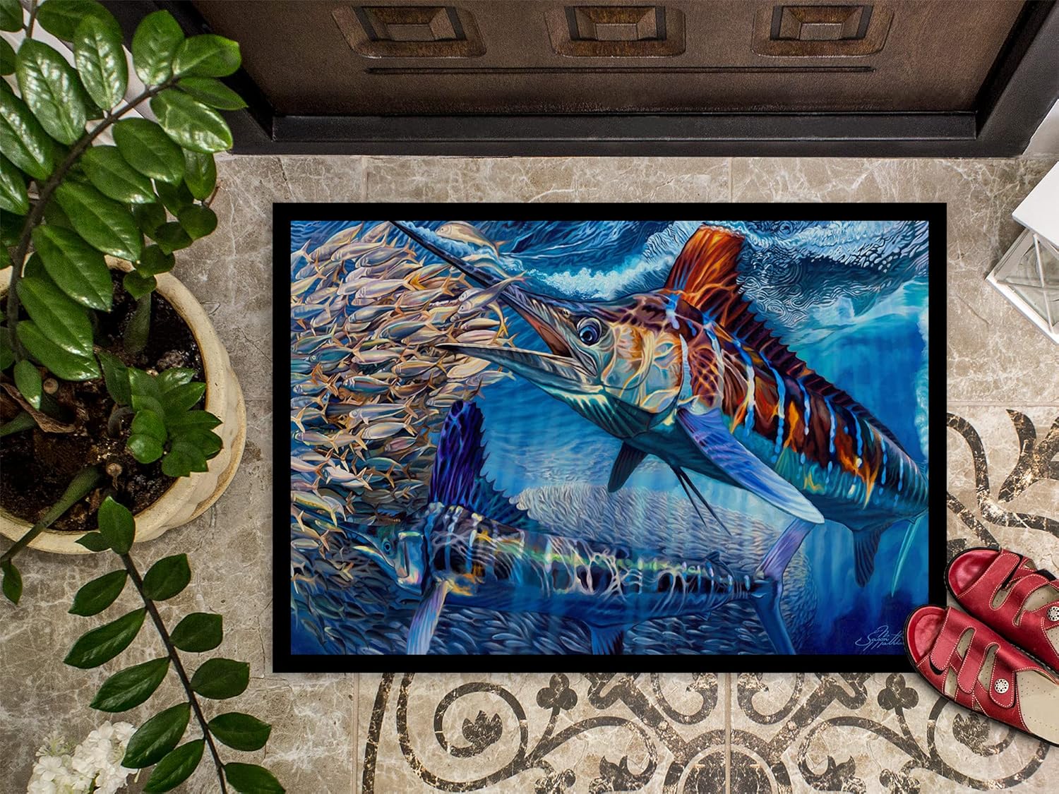 Welcome your family and friends with this Artwork mat in full color. This action backed mat with hold up in almost any weather condition. This door mat measures about 18 inches by 27 inches and has a black binding tape to hold it's many layers together. The top layer is a polyester felt that is dyed with the image that you see on the mat. The next couple of layers give the mat stability and the bottom of the mat is rubber that has been stamped to help prevent slipping. To clean this mat, hose it off with a water hose or use a powerwasher. Do not use any cleaner that produces suds.