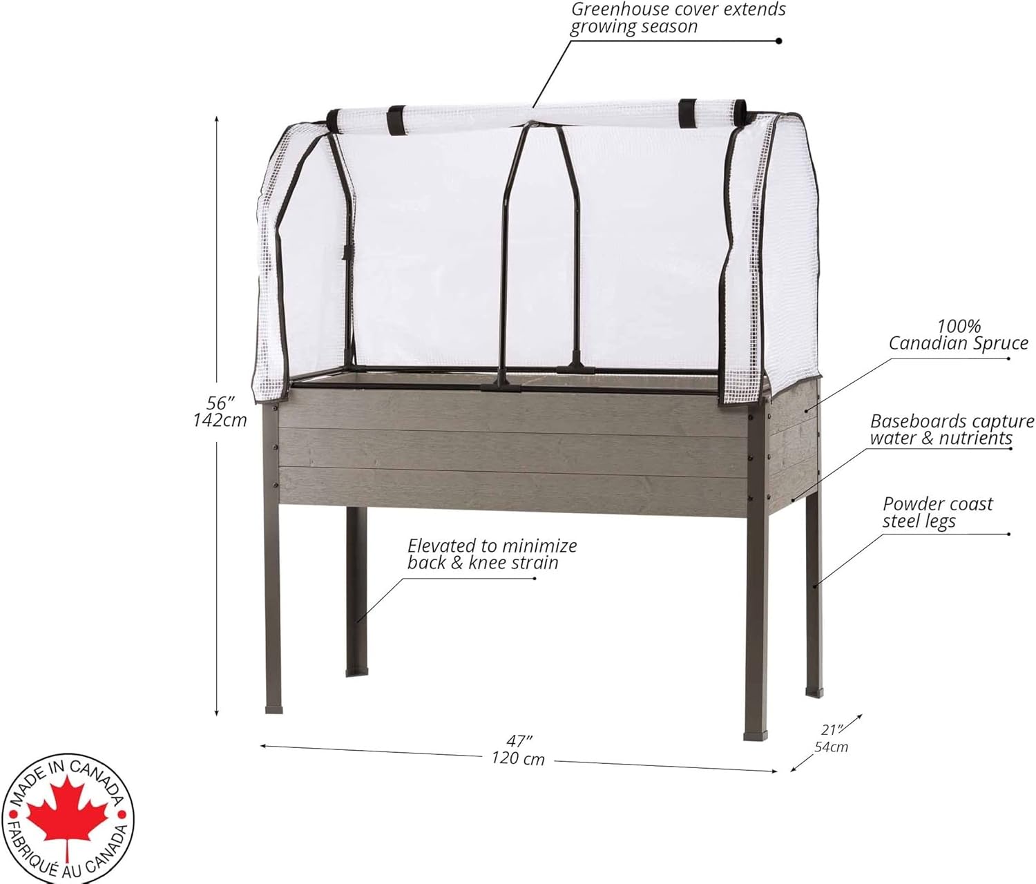 Perfect for patios, balconies or backyard gardening. Grow tomatoes, vegetables, herbs or your favorite flowers anywhere. Elevated planters let you garden in comfort alleviating the need to bend or stoop while protecting your plants from uninvited guests. Manufactured in Canada from sustainably sourced Canadian Spruce with combed exterior finish and stained for a beautiful modern look. The greenhouse cover provides the perfect microclimate for your plants. Start planting earlier and extend the growing season to increase your harvest. The steel frame installs in minutes with convenient push-fit connectors and the frame attaches to your planter to ensure it stays put. The reinforced polyethylene greenhouse cover attaches to frame with Velcro tabs. The cover or the entire frame can be easily removed from the planter. A dual zipper door makes for easy access to attend or harvest your plants. Perfect for patios, balconies or backyard gardening. Grow tomatoes, vegetables, herbs or your favorite flowers anywhere. Elevated planters let you garden in comfort alleviating the need to bend or stoop while protecting your plants from uninvited guests. The greenhouse cover provides the perfect microclimate for your plants. Start planting earlier and extend the growing season to increase your harvest. Manufactured in Canada from sustainably sourced Canadian Spruce with combed exterior finish and stained for a beautiful modern look. Legs are powder coated steel. Unique plastic baseboard system captures water & nutrients for healthy productive plants and extends the life of your planter Assembled outer dimensions: 21.0 x 47.0 x 29.5”H (53.5”H with cover). Planting area: 19.6 x 45.4 x 8.9”D. Soil capacity: 4.6 cubic feet.