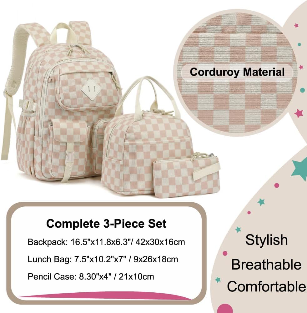 Upgrade your school essentials with this adorable Corduroy Backpack 3-Piece Set, designed specifically for girls and boys in grades 3 through high school. 2 main compartments, 3 front pocket and 2 side pockets to keep books, stationery and basic necessities organized. Crafted from premium, breathable corduroy fabric, this backpack set combines comfort, durability, and trendy style to keep your student organized and confident all day long.
