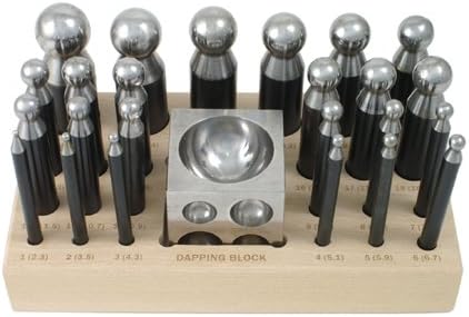 Our deluxe dapping punch and block set is ideal for doming soft metals. This set includes 24 steel dapping punches ranging from 2.3-25 mm (3/32 - 1”) in diameter; a dapping block cube with 18 half-sphere depressions ranging from 3.5 - 39 mm (1/8 - 1.56”) in diameter; and a hardwood stand to hold all the pieces. Each dapping punch has its size engraved on it. All punches are made of polished tool hardened steel and measure 3.5” (9 cm) long. Punch sizes in mm: 25, 23.4, 21.8, 20.2, 18.6, 17, 16.2, 15.4, 14.8, 13.8, 13, 12.3, 11.5, 10.7, 9.9, 9.1, 8.3, 7.5, 6.7, 5.9, 5.1, 4.3, 3.5, 2.3. The dapping block is made of polished tool hardened steel and measures 2 x 2 x 2” (5 x 5 x 5 cm). Depression sizes in mm: 39, 34, 29, 24, 19, 17, 14, 13, 12, 11, 10, 9, 8, 7, 6, 5, 4, 3. Wooden block is etched with measurement labels for each punch in millimeters. It measures 7.75 x 4.63 x 1.25” (19.7 x 11.8 x 3.2 cm).