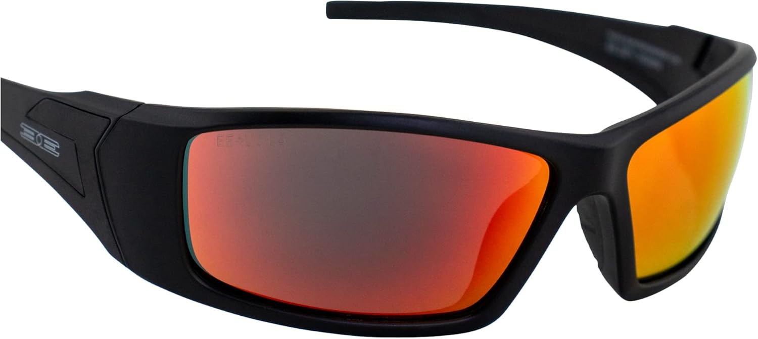 Whether you're riding your motorcycle, boating, fishing, playing golf, or just hanging out, these Epoch Eyewear Liberator black-frame sunglasses are the kind of stylish and sporty full-frame pair of shades you'll want to grab for all of your outdoor activities. Formerly Epoch 3, the Liberator is named in honor of "the bike that won the war." When you get this set you'll have a black pair with smoke lenses as well as another black pair with red mirror lenses. Thanks to co-injected inlaid rubber built into the arms, your shades will always be ultra-comfortable. Smoke lenses provide block out the most amount of light, making them perfect for super-sunny days. The red mirror lens sunglasses provide 100% UVA/UVB protection while also increasing depth of field and vision, reducing eye strain and providing good visibility, helping your eyes adjust to contrast. Mirror lenses are constructed by applying a reflective coating to a smoke lens base. These unique products deliver the same protection as smoke lenses but have the added benefits of enhanced color perception while reducing glare, all due to the addition of the color reflective coating. Ideal for full-sunlight, snow, and water-reflective conditions. Light transmission is 10 to 13% depending on reflective coating applied. Shatterproof polycarbonate lenses block 100% of UV rays. This style has been a favorite for golf, motorcycle and everyday use. Epoch Eyewear is a Veteran owned-and-operated company. We are proud to be a part of the Veteran community and build a company that provides jobs and great products. Try us! We promise you'll love us and our high-performing, great-looking products.Dimensions(mm):Temple Width: 138Arm Length: 118Lens Height: 32