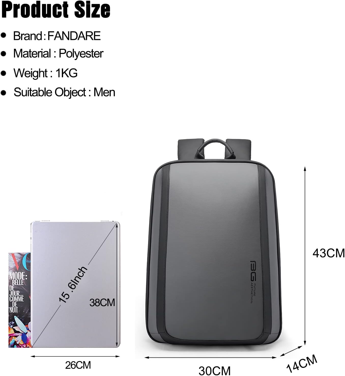 FANDARE Laptop Backpack Travel Laptop Rucksack BagCasual (keep your hands free and avoid a bulky backpack)Outdoor & Indoor Sports (gym,business, walking,hiking, camping, climbing, running,cycling, bike riding)Multipurpose(as professional office work bag, slim daypack, daily rucksack)Warmth & Happiness(Men/Women & Best Gift Ideas for friends, families, traveler)Luggage Fixed Strap (The perfect carry-on compliant bag for airline travel. Integrated trolley sleeve slides over rolling luggage handle making airport travel a breeze)3D Sports Car Design Concept(Stylish & Gentleman & Simple)Comfortable to wear & Plenty of roomDimension: 30x14x43 cm (length x width x height)Separate Laptop Compartment: Fits 15.6,15,14,13 inch Laptops and MacBook(Laptop over 17 inch is not recommended)Main Compartment: laptop + tablet Independent Compartment+open pocket+other capacityOther capacity: rear pocket+shoulder pocketLaptop daypacks fits 15.6 inch laptop, 9.7 inch tablet, headset, thin clothes, books, magazine, camera, pen, keys, wallet, etc.Ergonomics Back & Shoulder Strap design, soft and comfortable, breathable, decompression.Made of high density and water repellent Polyester Fabric, not easy get wet and ensure long lasting usage.Many padding on the back, shoulder straps, which make it comfortable to carry, barely feel the weight.Comfortable wide breathable mesh shoulder straps with plentiful sponge pad help relieve the stress from your shoulder.ServiceFANDARE is committed to the whole-hearted service for each customer to win most customer satisfaction.Our aims is to consistently create and provide the best,more practical and durable, versatile bag to everybody. Then take your bag, enjoy and discover wonderful world.