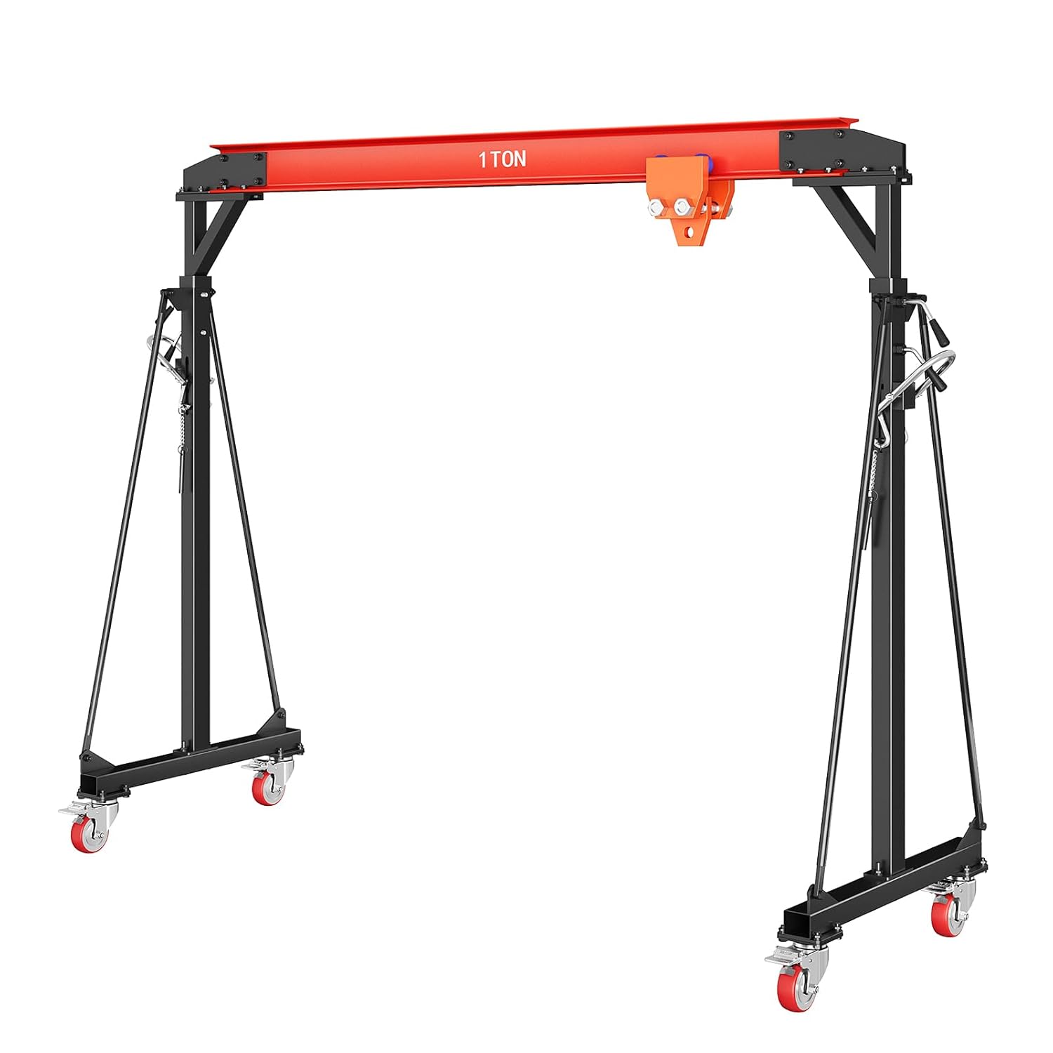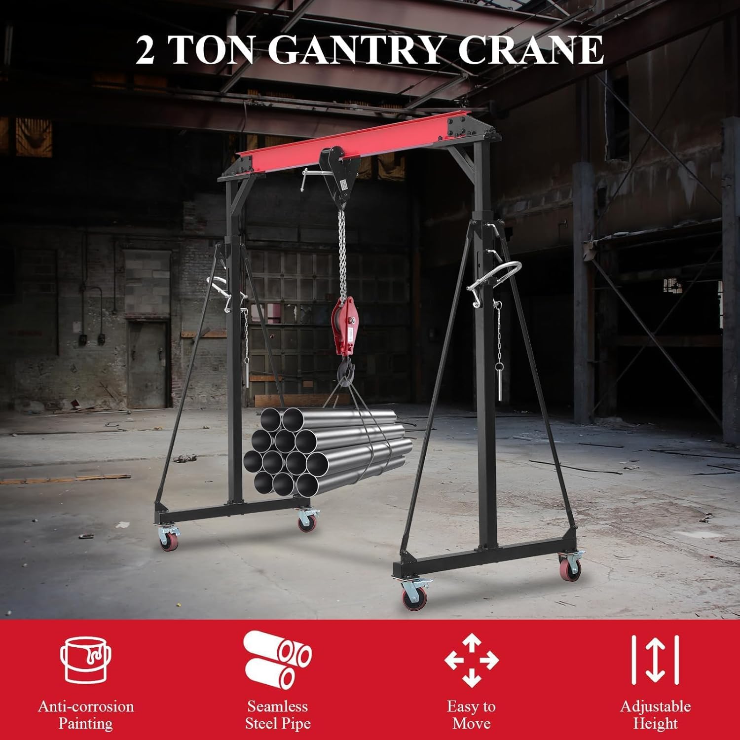 PLEASE NOTE: This gantry crane should not be moved when under load. A 7.5 FT minimum height is required for clearance.The Adjustable Gantry Crane, a reliable solution for your lifting needs. This portable shop lift hoist is designed to handle heavy loads with ease. Whether you are working in a factory, construction site, warehouse, or car repair shop, this crane is ideal for lifting and moving materials efficiently. Constructed to provide durability and stability. Its adjustable height feature allows for versatility in different working environments, making it a versatile tool for a variety of applications.