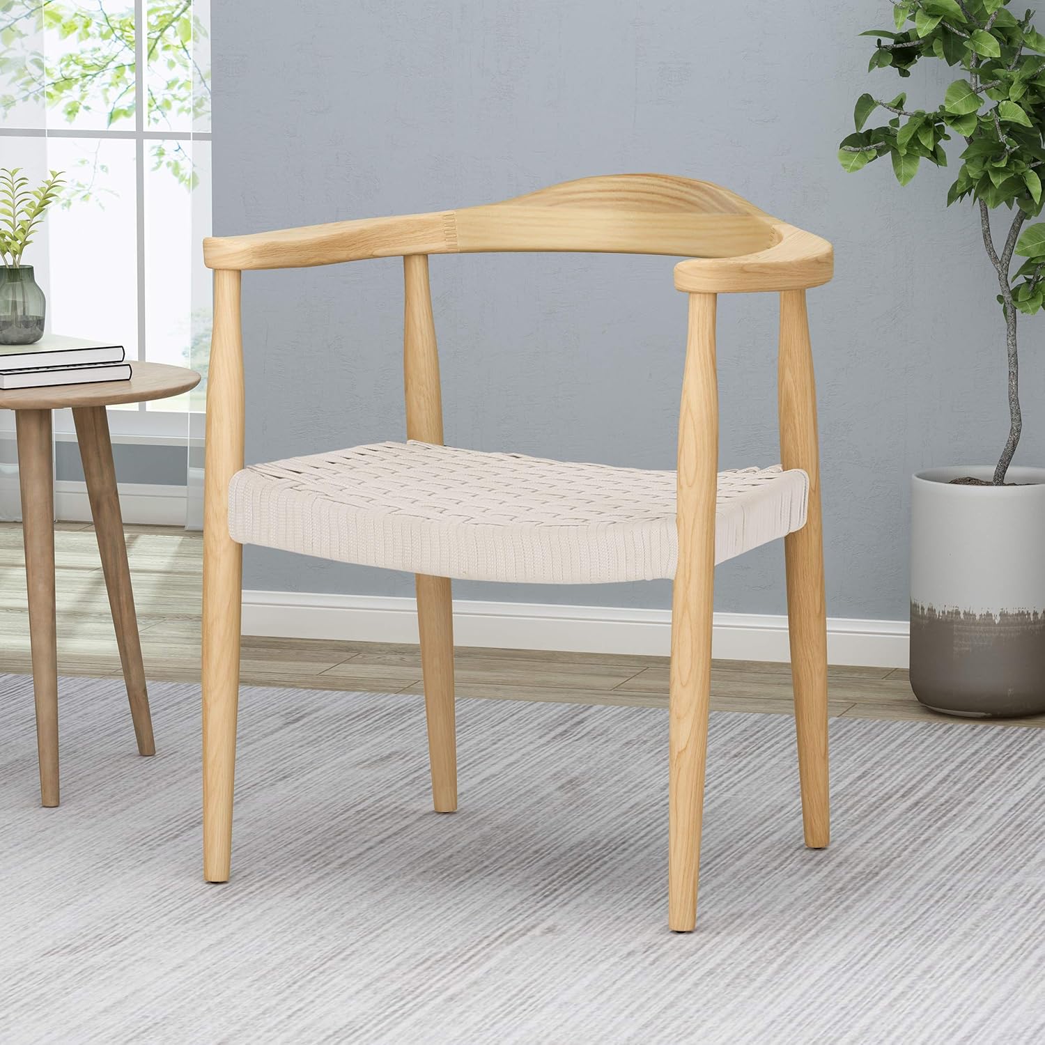 Surround yourself with exquisite design and unique style with our set of club chairs. These dining chairs bring together stunning, hand-crafted flat rope weave with smooth ash wood frames to create a comfortable space for your home. With sturdy, solid frames, curved backrest, and beautifully textured design, these chairs will have no problem blending into your outdoor decor with its modern style and incredible durability. Its mid-century modern vibes bring your home together with a flourish that will impress all your guests. MID-CENTURY MODERN: Blending together iconic tapered legs with a stunning wood frame, our chair offers a mid-century look to your lounge space. With its clean lines and understated look, this club chair uses new materials to reimagine a traditional design. ASH WOOD: From its dense, shock-resistant properties to its durable yet lightweight structure, this gorgeous ash wood is made to last. This wood features a distinct ring pattern and smooth open grain that complements its strength, hardness, and weight. ROPE WEAVE: This set features an intricate flat rope weave design that provides an incredibly durable and unique appearance. The handcrafted details of this material allow this piece to blend seamlessly with your interior decor. DIMENSIONS: Choose an accessory that is the perfect size for you and your furniture. This club chair is 25.00” W x 21.25” D x 29.50” H. You will love how much your space can transform with the simple addition of this charming chair. NO ASSEMBLY: This club chair comes ready to use straight out of the box. No assembly is required. Includes: One (1) Accent Chair Frame Material: Ash Wood Seat Material: Olefin Rope Composition: 100% Olefin Seat Color: Matte White Frame Finish: Natural Hand-Crafted Details No Assembly Required Dimensions: 21.25 inches deep x 25.00 inches wide x 29.50 inches high Seat Dimensions: 18.00 inches deep x 20.00 inches wide x 17.75 inches high Arm Height: 27.75 inches