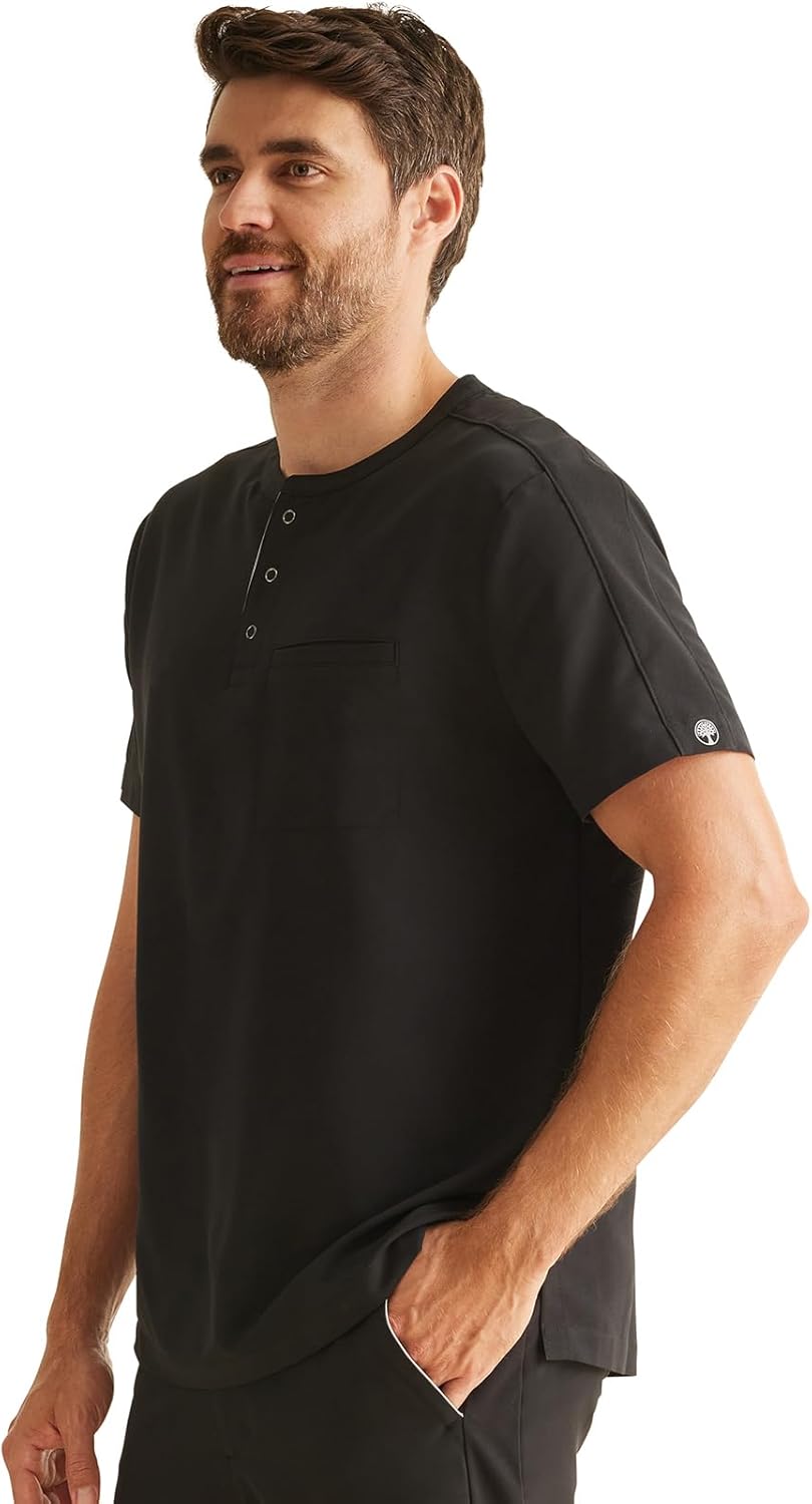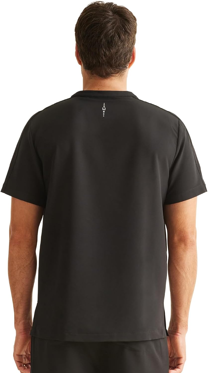 The Men’s Shane medical scrub top combines modern athletic styling with practical features to deliver ultimate functionality and a sleek, professional look. With a contemporary fit and a 28 1/2" center back length, this top is designed for a sharp, streamlined appearance, ideal for demanding work environments. A mandarin collar with a snap-closure placket and reflective trim adds both sophistication and practicality to the neckline. The welt chest pocket provides convenient storage, while racer-style sleeves with dyed-to-match knit trim from collar to hem enhance its sporty aesthetic. Side vents ensure easy movement and comfort, making this top versatile enough to wear tucked or untucked. Crafted from a high-performance fabric blend of 56% recycled polyester, 36% polyester, and 8% spandex, the Shane Top is lightweight, moisture-wicking, and equipped with 360° stretch for maximum flexibility. This sustainable fabric ensures durability and eco-friendly benefits, ideal for professionals looking to make a stylish and conscientious choice. Whether you’re on the move or handling your daily tasks, the Shane Top offers unmatched comfort, functionality, and contemporary style for the modern professional.