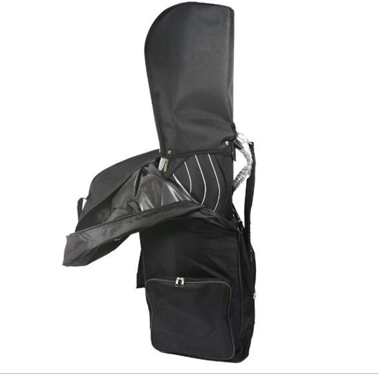 Description: A Golf travel cover with padded club head area. Size approx 130x45x45cm and weight approx 2kg. Wheels for easy transportation and a shoulder strap. It has another handle on the top and a front pocket. It is lightweight and very durable. There is more than enough room to get the largest of golf bags into it. There is a section for your address to be put into.