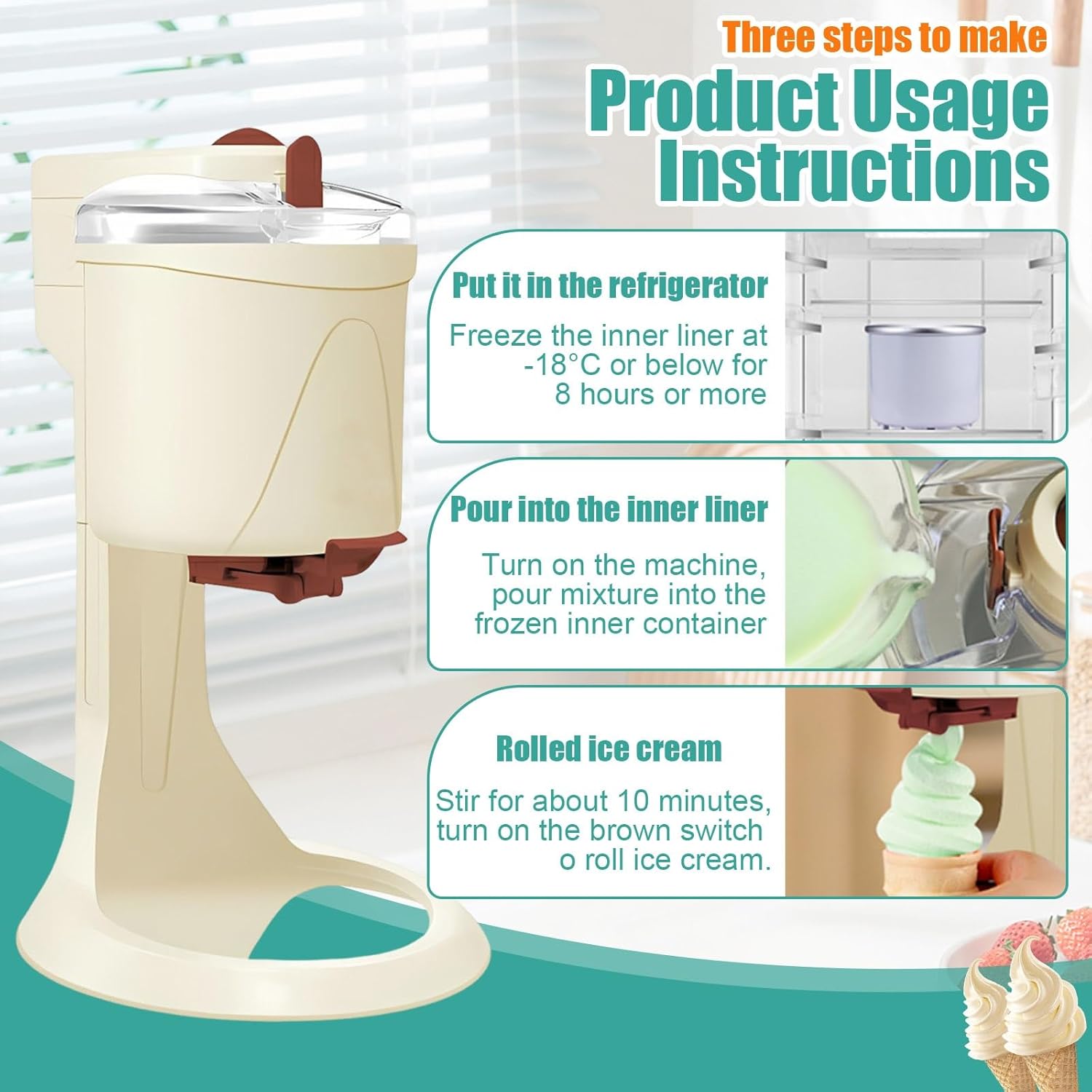 Enjoy fresh, homemade chilled desserts anytime with this Ice Cream Maker Machine designed for everyday home use. This compact yet powerful Home Ice Cream Maker uses a pre chilled bowl ice cream maker system to deliver smooth, creamy results in minutes, helping you skip store lines and enjoy ice cream whenever cravings hit. Whether you’re making classic flavors or experimenting with new recipes, this ice cream machine for home makes dessert simple, fast, and fun.✿ Main Features:Automatic Ice Cream Maker one-touch use, ice cream in minutes for home use.Pre chilled Bowl Ice Cream Maker no compressor, fast soft serve results.1L / 1000ml Mini Ice Cream Machine compact size, family capacity.Fruit Ice Cream Maker & chilled Yogurt Maker for healthy, dairy-free desserts.Soft Serve Ice Cream Maker smooth texture, easy to clean.✿ Product Specifications:Product name: Ice Cream MakerMaterial: High PP+aluminumVoltage: 110V/230VPower: 20WVolume: 1L/1000MLProduction time: 10 minutesMachine size: 42.5×27×24cm/16.7×10.6×9.4inAluminum liner size: 11×11×10.5cm/4.3×4.3×4.1inWeight: 3KGScope of application:leisure food factory equipment, beverage shop equipment, coffee shop equipment, tea restaurant equipment, etc.✿ Package List:Ice cream maker×1✿ Warm Tips:✔Manual measurements may result in a slight 1–2 cm variation.✔Minor color differences may occur due to lighting and display ; please refer to the actual product received.✔If you have any questions, feel spare to reach out. Our team is committed to helping you and will reply within 24 hours.