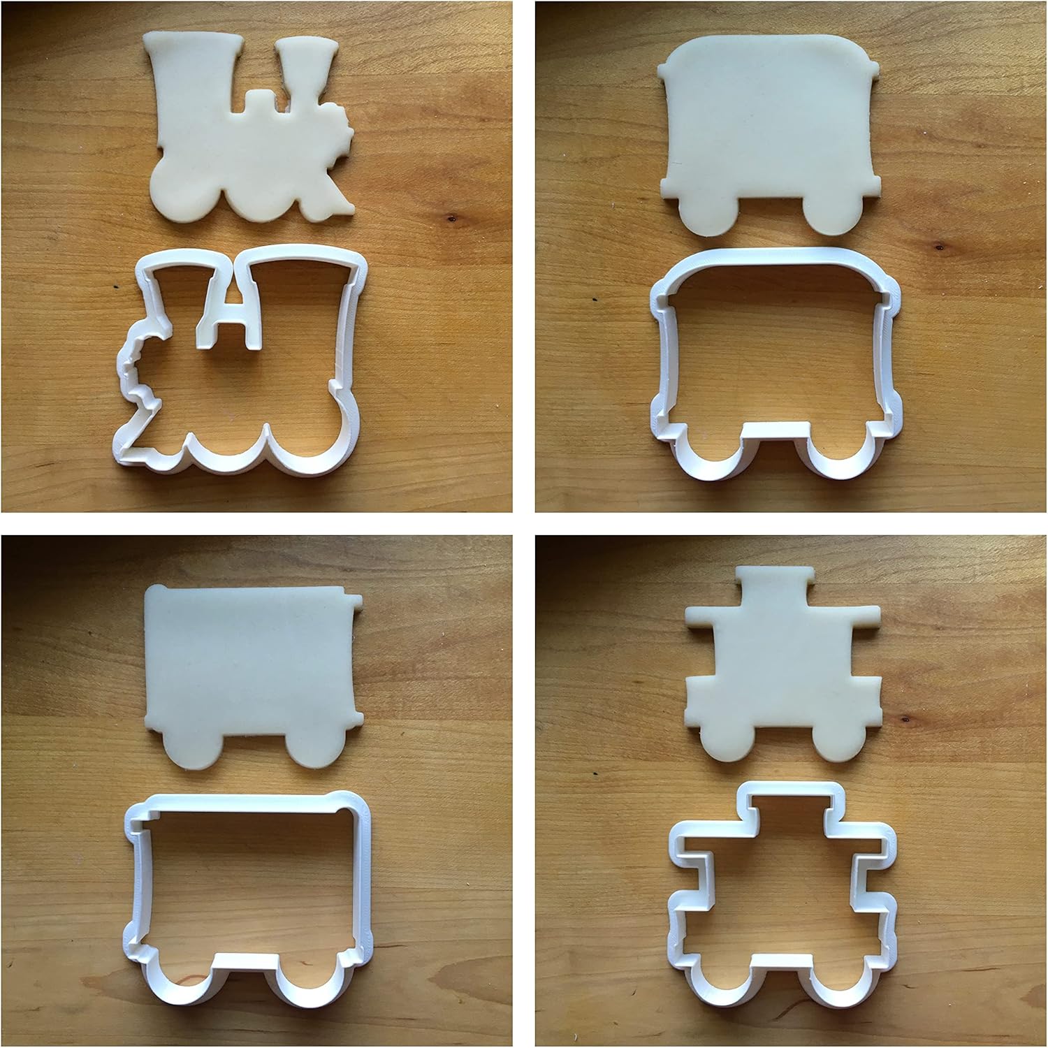 DISHWASHER SAFE! Made of food safe PLA plastic. Measures 3/4" deep. Comes with one of each style: engine, passenger car, boxcar, and caboose. This cookie cutter comes in multiple sizes and are measured by their largest dimension (ie if the cutter is 3" x 2", it will be listed as a 3" cutter). No returns unless damaged in transit. Colors may vary. Our cutters are made from dishwasher safe plastic and are fine to place into your dishwasher.
