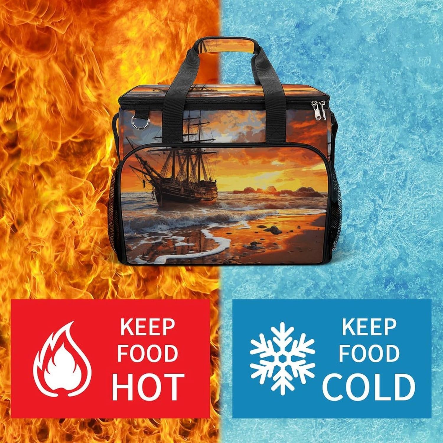 Take Your Meals Anywhere with Pirate Ship in The Sunset Grocery BagsFood Container Carrier Oxford Fabric Picnic Bag Heat Retaining Food Bag Camping Cooler BBQ Accessories Cute Picnic Bag with Pockets Insulated Food Bag for Work Insulated Lunch Tote Bag Camping BagTemperature Control That WorksThe upgraded aluminum foil lining creates an effective thermal barrier. Your drinks stay refreshingly cold, and your hot dishes maintain their warmth for hours. No more lukewarm meals during outdoor outings.Thoughtful Storage DesignTwo side mesh pockets - Perfect for water bottles or umbrellasFront zippered pocket - Keeps keys, phone, or condiments organizedInternal mesh pocket - Stores utensils, napkins, and small essentialsMain compartment - Spacious enough for food containers and snacksBuilt for Daily AdventuresConstructed from high-density oxford fabric with reinforced stitching at stress points. The double zippers are sturdy and smooth-operating. Reinforced handles let you carry heavy loads with confidence.Carry Your WayHandles for quick grabbingStands upright for easy packing and accessPerfect For:Picnics in the parkBeach days and pool partiesCamping and hiking tripsOutdoor concerts and festivalsDaily work lunchesGym and fitness classesRoad trips and travelGrocery shoppingSpecifications:Dimensions: 15.4 x 11.8 x 11.8 inchesMaterial: High-density Oxford fabricLining: Aluminum foil (insulated)Closure: Sturdy double zippersPockets: 2 side mesh, 1 front zipper, 1 internal meshCare: Hand wash or machine wash, do not bleachNote: Food containers and utensils shown in images are not included.