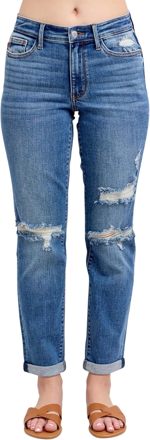 The Judy Blue Women's Mid-Rise Vintage Wash Cuffed Destroyed Boyfriend Jeans combine comfort and style in one perfect pair of jeans. Designed with a relaxed fit, these jeans feature a vintage wash that gives them a timeless, worn-in look. The mid-rise waist offers a comfortable fit, sitting just below the belly button for a flattering silhouette. With distressed detailing and cuffed hems, these jeans capture the essence of effortless, laid-back style, making them perfect for casual outings or adding a touch of edge to your everyday wardrobe.Crafted from Judy Blue's signature stretchy denim, these boyfriend jeans offer all-day comfort without compromising on style. The destroyed accents add an extra layer of personality, while the cuffed legs give them a trendy, relaxed vibe. Whether paired with a simple tee or a stylish blouse, the Judy Blue Women's Mid-Rise Vintage Wash Cuffed Destroyed Boyfriend Jeans are versatile enough to elevate any look. Ideal for anyone looking for a blend of vintage charm and modern comfort, these jeans are a must-have addition to your denim collection.