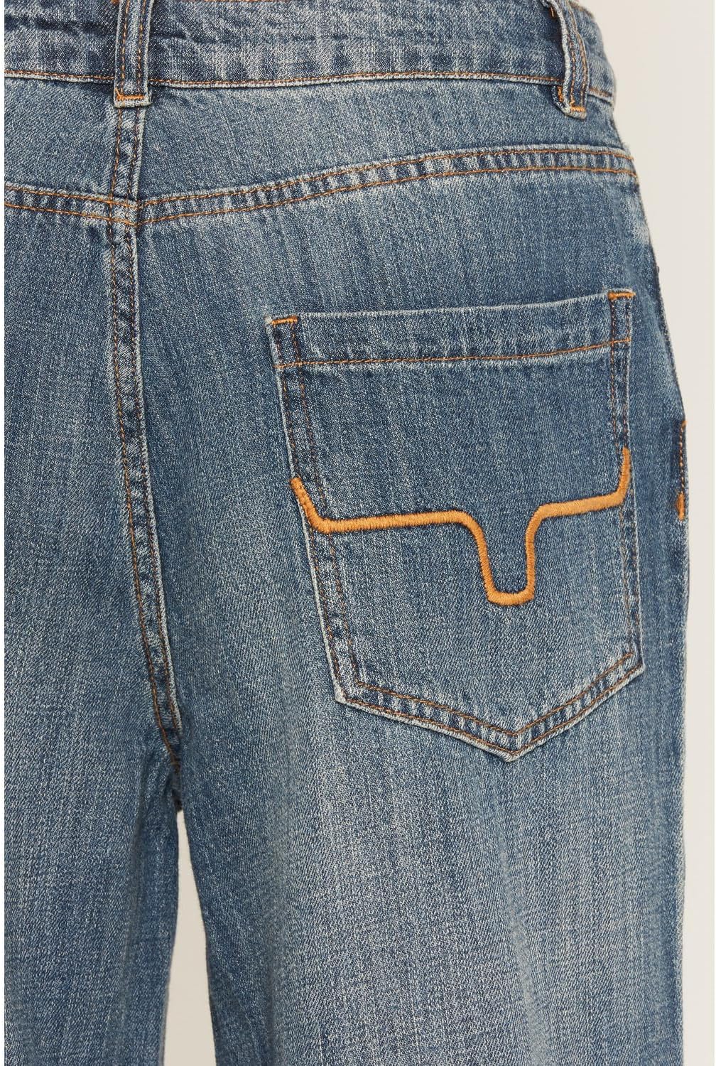 The Kimes Ranch Maggie jean delivers effortless structure with a relaxed, modern edge. Designed with a low-rise waist and ultra-relaxed stovepipe leg, Maggie creates a laid-back silhouette with clean, elongated lines. The stovepipe shape maintains structure through the leg while offering a roomy, comfortable fit that moves naturally. Crafted from 10 oz antique wash denim, Maggie features 100% cotton construction for authentic, classic denim feel with durable performance. The mid-wash finish adds lived-in character, while signature back pocket detailing brings subtle western heritage to the design. With its relaxed profile and timeless wash, Maggie transitions seamlessly from casual styling to elevated everyday wear.