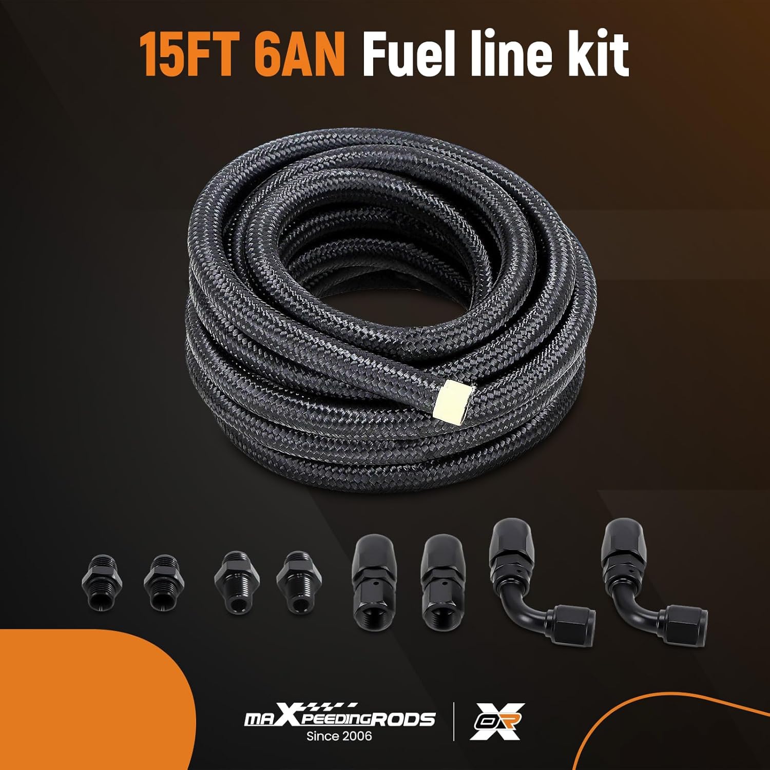 | Included Components | 1x 15' foot of premium -6 steel braided hose, 2 x 6 an straight hose ends, 2 x 6 an 90 degree hose ends, 2 x 1/4"npsm x -6 transmission fittings, 2 x 1/4"npt x -6 radiator fittings black |