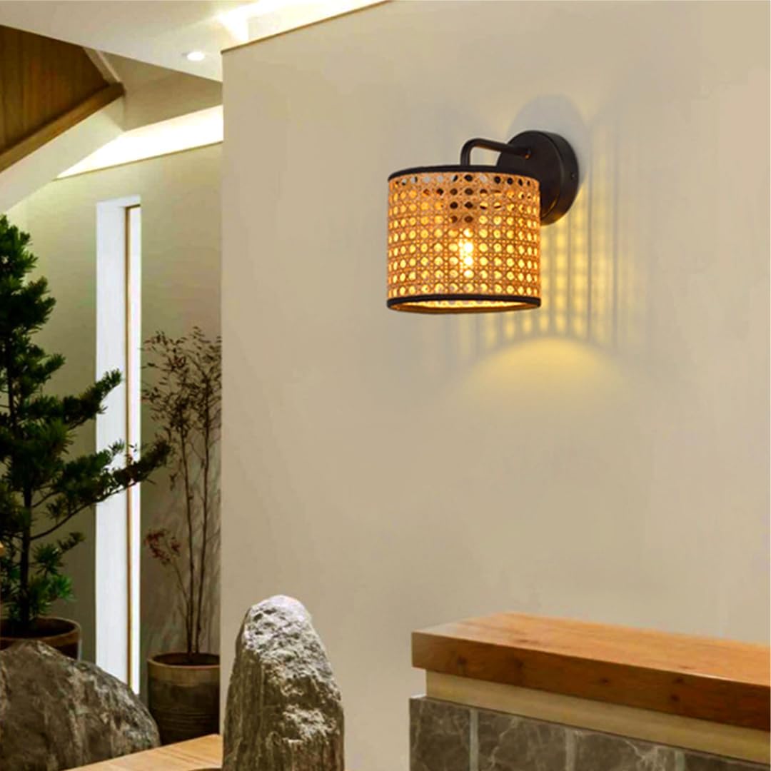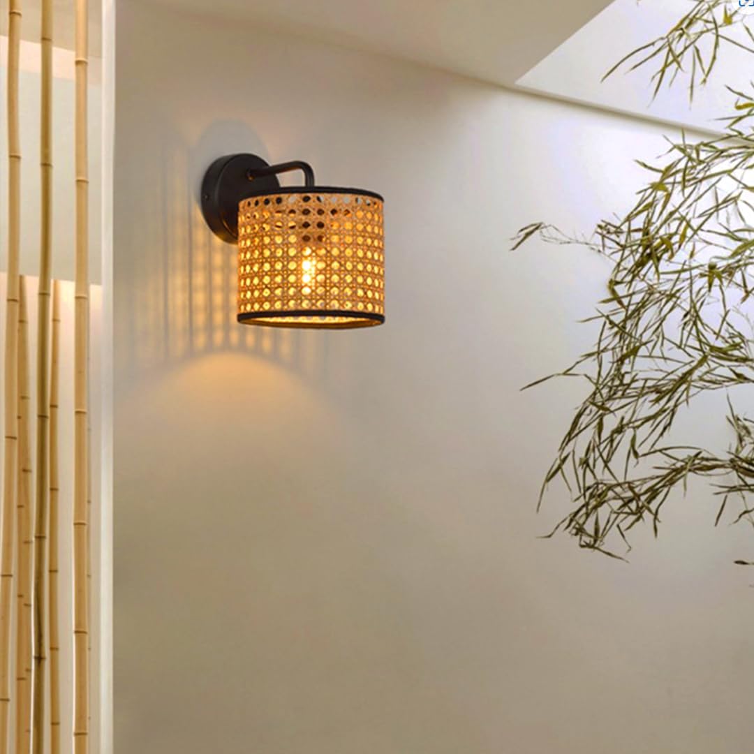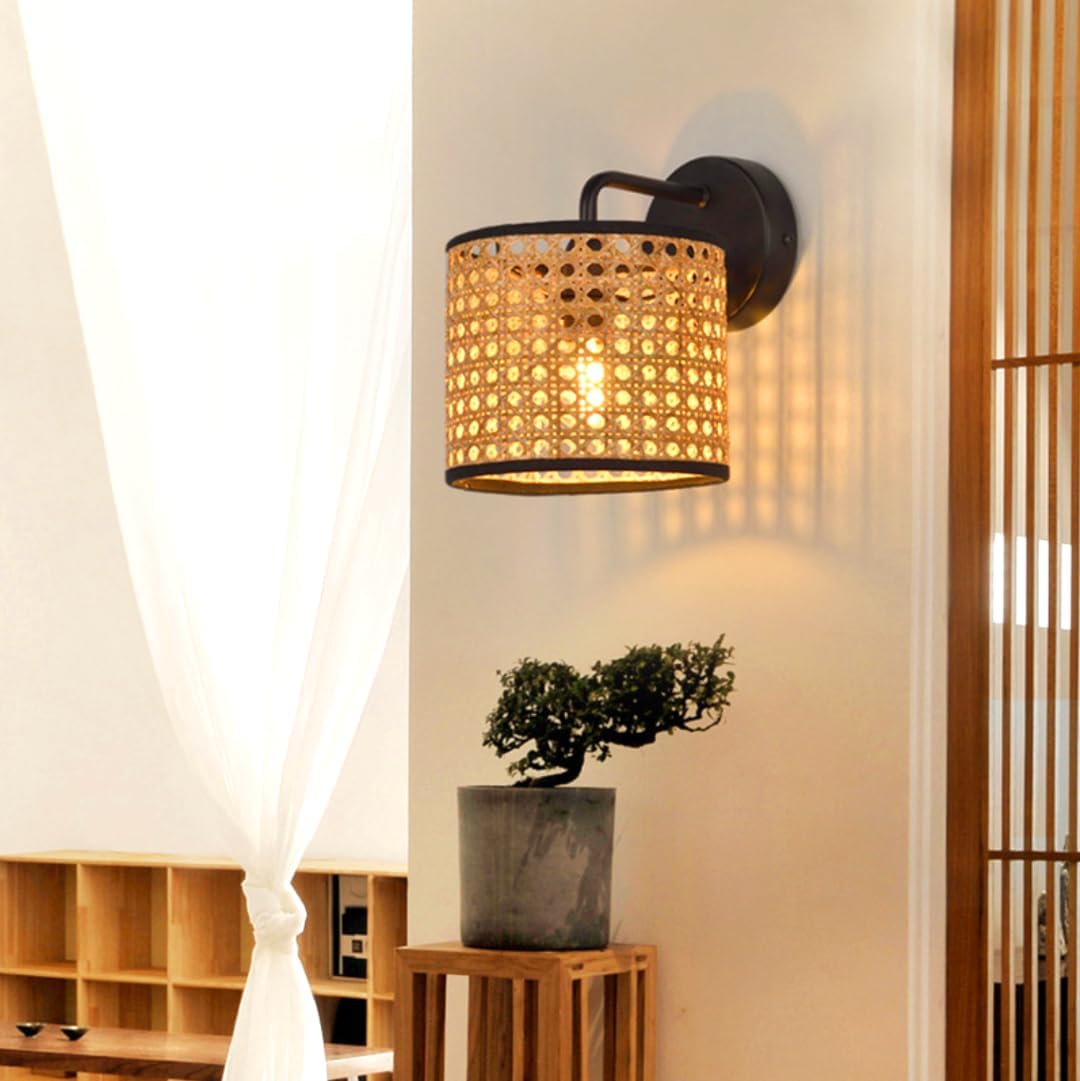 🍃 FEATURES:▸Handmade with selected natural rattan techniques, it has the characteristics of good flexibility and natural texture.▸The lighting is warm and soft without dazzling, with sufficient brightness and a unique hazy feeling.▸The thickened metal hardware base makes the wall lamp more sturdy in daily use.🍃 PARAMETER:[Name]: Rattan Wall Lamp[Style]: Wabi-Sabi [Color]:(Lampshade:Original) (Tron base:Black)[Material]: Iron, Rattan[Lampshade diameter]: 20CM/7.8INCH(D), 14CM/5.6INCH(H).[Distance from wall]: 25CM/9.9INCH.[Chassis diameter]: 10CM/3.9INCH, Chrome.[Lamp holder]: E27 for Europe, E26 for America[Bulb]: A 5W LED bulb, Warm Light[Weight]: 1000g[Usage scenarios]:living rooms, bedrooms,restaurants,,bedsides coffee shops, hotels, corridors🍃PACKAGE INCLUDED:1 x Rattan Wall Lamp1x Bulb