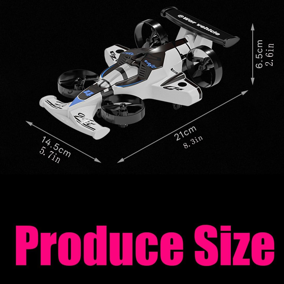 Features: 1. 2-in-1 mode: High-speed ground travel + low-altitude hovering flight 2. Motion-sensing control, intuitive and easy to use 3. Colorful LED lights + one-button special effects (flip/rotate) 4. Impact-resistant and lightweight body, suitable for multiple scenarios 5. 3.7V 500mAh USB rechargeable battery, long battery life 6. Stable 2.4GHz signal, supports simultaneous control of multiple units 7. Fully assembled design, ready to play out of the box, no additional setup required 8. Suitable for all ages, the first choice for indoor and outdoor dynamic entertainment 9.Compact integrated design, balancing ground and aerial performance Specification: Name:Rechargeable Dual-Mode Car Drone Main Material:Acrylonitrile Butadiene Styrene (ABS) Special Feature:Remote Controlled Recommended Age: 14+ Color:Purple/white/Green Gyroscope: 6-axis Frequency: 2.4GHz Channels: 4-channel Flight Time: Approx. 7 minutes Drift Time: Approx. 15 minutes Charging Time: Approx. 60 minutes Remote Controller Mode: Mode 2 (Left Throttle) Remote Controller Power Supply: 3 x 1.5V AAA Batteries (Not Included) Remote Control Distance: Approx. 100 meters Remote Control Mode: left hand for throttle, right hand for steering Flight Performance: Multi-speed adjustment, headless mode, 360° flip, drift mode, one-key takeoff and landing, circling flight Suitable for: Indoor & outdoor use Assembly: Fully assembled Size:14.5*21*6.5cm/5.7*8.3*2.6in Weight:319.2g/0.7lb How to Use 1. Charge the Battery Use the included USB cable. Full charge: 60–90 minutes 2. Insert Battery & Power On Place battery inside the vehicle and switch it on 3. Turn On the Remote Move joystick up and down to pair 4. Choose Your Mode Drive Mode: Use like an RC car Drone Mode: Press flight button to take off 5. Fly or Drive with Confidence Steer, accelerate, hover, turn, and switch modes instantly Package Contents: 1 pieces*Rechargeable Dual-Mode Car Drone 1 pieces*Remote Control 1 pieces*Instruction Manual 1/2/3 pieces*Batteries 1 pieces*Charging Cable、Spare fan blades 1 pieces*Gift-Ready Original Box Notes: 1.Due to manual measurement, lighting shooting reasons and the real thing will be slightly different, please understand 2.Due to different displays and different lighting, the picture may not reflect the actual color of the item. Thank you for your understanding 3. There are many kinds of products in our store, please browse patiently. I believe you will find the products you like, I wish you a happy shopping 4. We value every customer and provide enthusiastic customer service. If you have any questions, please contact us. Thank you for your understanding and wish you a happy shopping