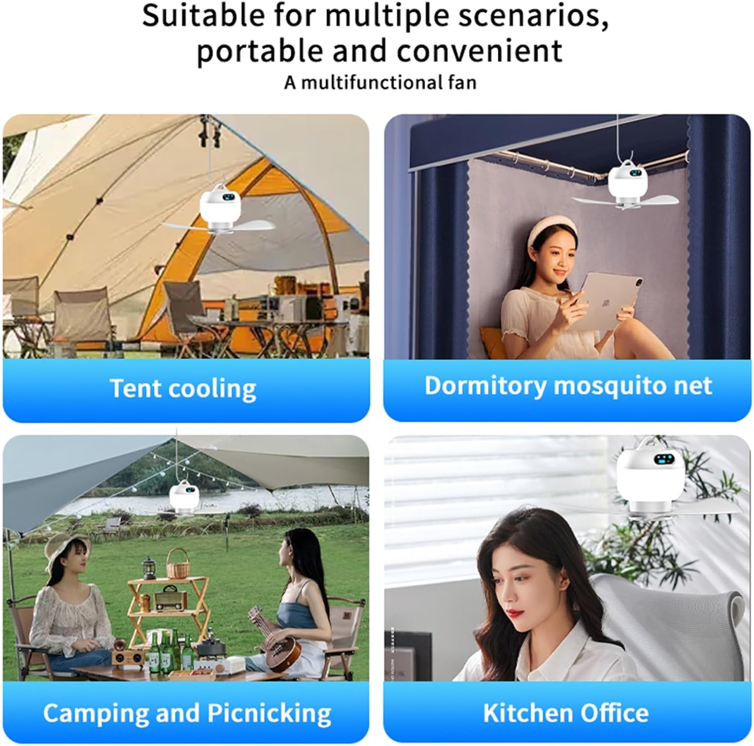 Remote Control Fan with Night Light USB Rechargeable 3 Modes Detachable Low Noise 36dB Portable for DormFeatures:Portable design: Lightweight structure, easy to carry, very suitable for camping, picnicing, outdoor activity, office, kitchen and dormitory use.USB Plug in: USB plug in, compatibility with various devices such as computers, mobile power adapters, making charging Remote control operate: Equipped with remote control, it can be timed and easily adjusted for speed and night light setting, without the need to be close to the fan, making it more to use.Multiple speed speed: Provides 3 speed option to flexibly respond to cooling needs in different Night light function: Build in 3-speed soft night light, 360 degree surround light, suitable for night use, creating comfortable and increasing convenience.Easy to The detachable fan designing facilitates and maintenance, maintaining good usability.Specifications:Component: ABSColor: green, light yellow, white(optional)Main Body Size: approx. 108x87mm/4.25x3.43inchFan approx. 12x6.2cm/4.72x2.44inchMotor type: Brushless motorNoise: under 36dBmNumber of fan 3pcsSpeed gear: 3 gearsPower supply: USB plug-inInput: 5VInput current: 2APower: 15wUse time: 1st gear 10 hours; 2nd gear 9 hours; 3rd gear 8 hoursUse scenario: tent cooling, dormitory, camping and picnics, office and morePackage Includes:1 Piece USB Ceiling Fan1 Piece Charging Cable1 Piece Suspended Circlet1 Piece Remote Control1 Piece User ManualNote:Please allow 1-2cm errors due to manual measurement. Please allow for slight color differences due to different display resolution.