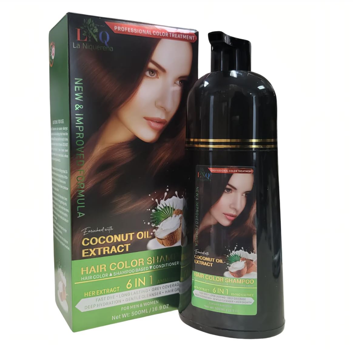 Coconut oil hair dye shampoo that covers gray hair while protecting hair health, repairing damage, and restoring split ends. Seals cuticles, strengthens follicles, and stimulates growth. Delivers natural, long-lasting color and mirror-like shine for up to 4 weeks, with low ammonia content and excellent coverage.