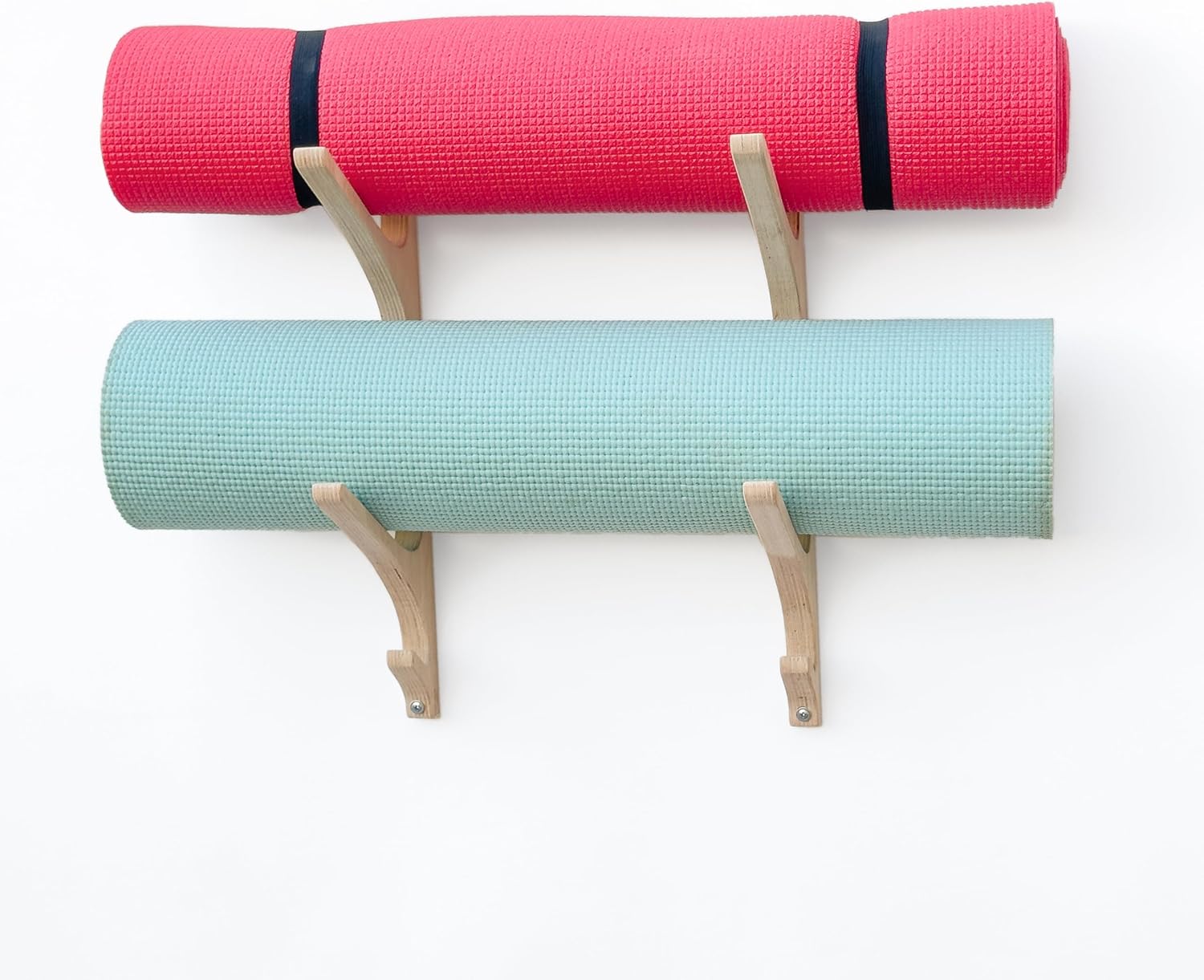 Wooden Wall mounted Yoga Mat Holder with wood hooks. Wooden stand is handmade from premium birch plywood. Your yoga mat will find its place in your yoga class, room, or gym. Also wooden hanging hooks are perfect for home, entryway as hangers for accessories. Inner diameter: 5.5 in. Maximum weight up to 7 kg (15 lbs) - 1 Tier. 9 kg (19 lbs) - 2 Tier. 11 kg (24 lbs) - 3 Tier. 13 kg (28 lbs) - 4 Tier. 15 kg (33 lbs) - 5 Tier. 17 kg (37 lbs) - 6 Tier. Contents: 2 lath with hooks made of plywood, template for holes, screws and plastic dowels. We have 4 colors - please choose color which is better for you. When you mount yoga mat holder on wall, you will create extra storage space in your home, yoga room, or gym. Transform your workout space with our premium handmade Wooden Yoga Mat Holder with hooks. Practical and stylish storage solution for yoga mats, towels, foam rollers, and fitness accessories. Designed with both aesthetics and functionality in mind, this wall mounted rack keeps your gear tidy and easily accessible while enhancing the look of your home gym or studio. Handmade from premium, eco-friendly plywood, this yoga mat holder is durable and built to last. The built-in hooks provide extra storage for resistance bands, yoga straps, towels, or gym bags. With its easy installation and sleek design, it’s the perfect blend of convenience and elegance for any fitness enthusiast.