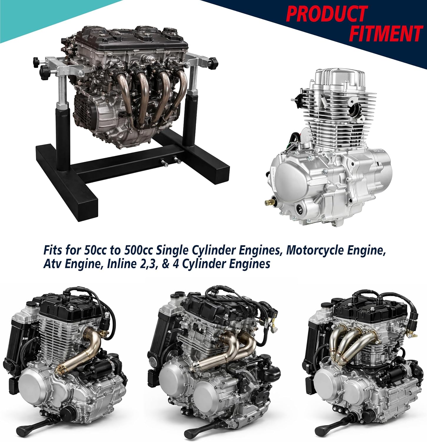 Built for Power, Stability & Precision — The Adjustable Engine Stand You Can TrustWhether you're rebuilding a motorcycle engine, inspecting an ATV motor, or tuning a small car engine, this 1000 lb Adjustable Engine Stand delivers professional-grade support and stability. Constructed from high-strength steel with reinforced welds, it stays rock-solid under load. The fully adjustable arms and base fit a wide range of engines, making it a must-have tool for any serious mechanic or DIY garage.The powder-coated anti-rust finish protects against corrosion, ensuring years of reliable use even in tough environments.Easy Assembly with All Hardware Included.Perfect for: Motorcycle, ATV, Go-Kart, and Small-Car Engine Rebuilds.